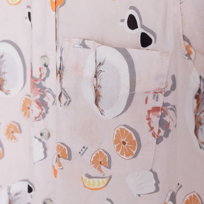 Boyfriend fit, short sleeve button up shirt, stand collar, one chest pocket, 25% certified recycled polyester matte buttons, back yoke panel with center back box pleat, curved hem.